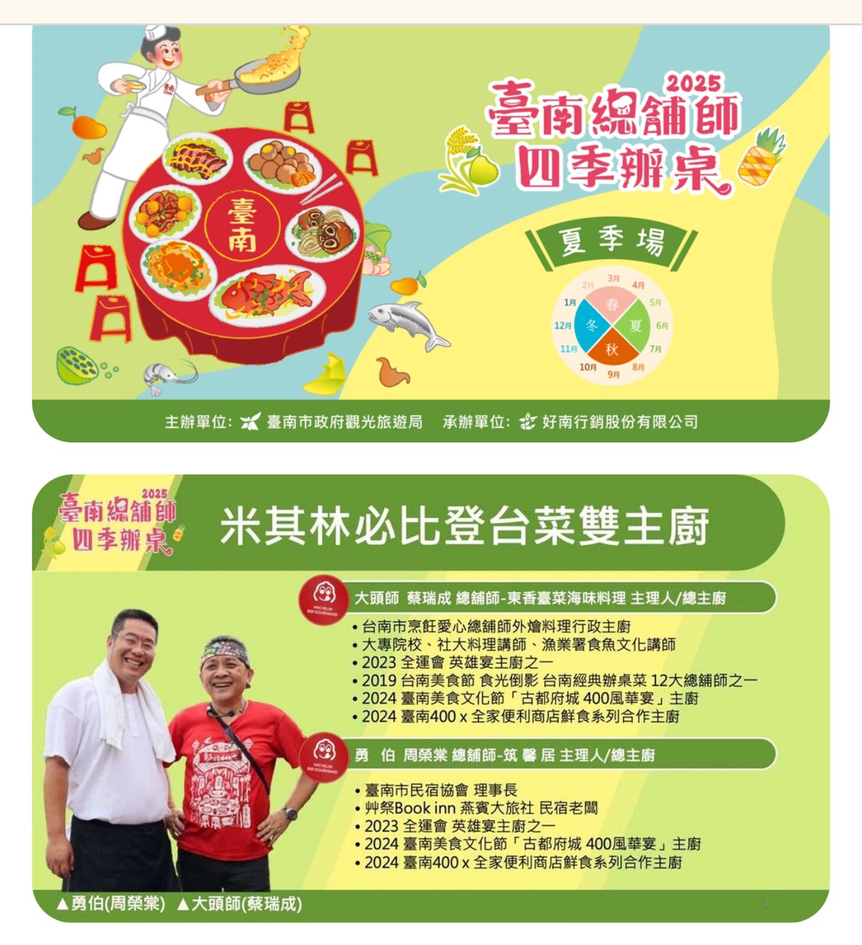 「2025台南總舖師四季辦桌夏季場」今(30)日中午於四草大眾廟熱鬧開桌,來自北中南的饕客齊聚一堂,除了品嚐由兩位米其林必比登推介名廚,東香台菜大頭師(蔡瑞成)與筑馨居勇伯(周榮棠)聯手推出的十道精緻手路菜,現場也有說菜、陣頭、古早味的台語唸歌、老歌金曲表演以及有獎徵答等節目,讓來賓在視覺、味覺與文化層面皆獲得豐富體驗。