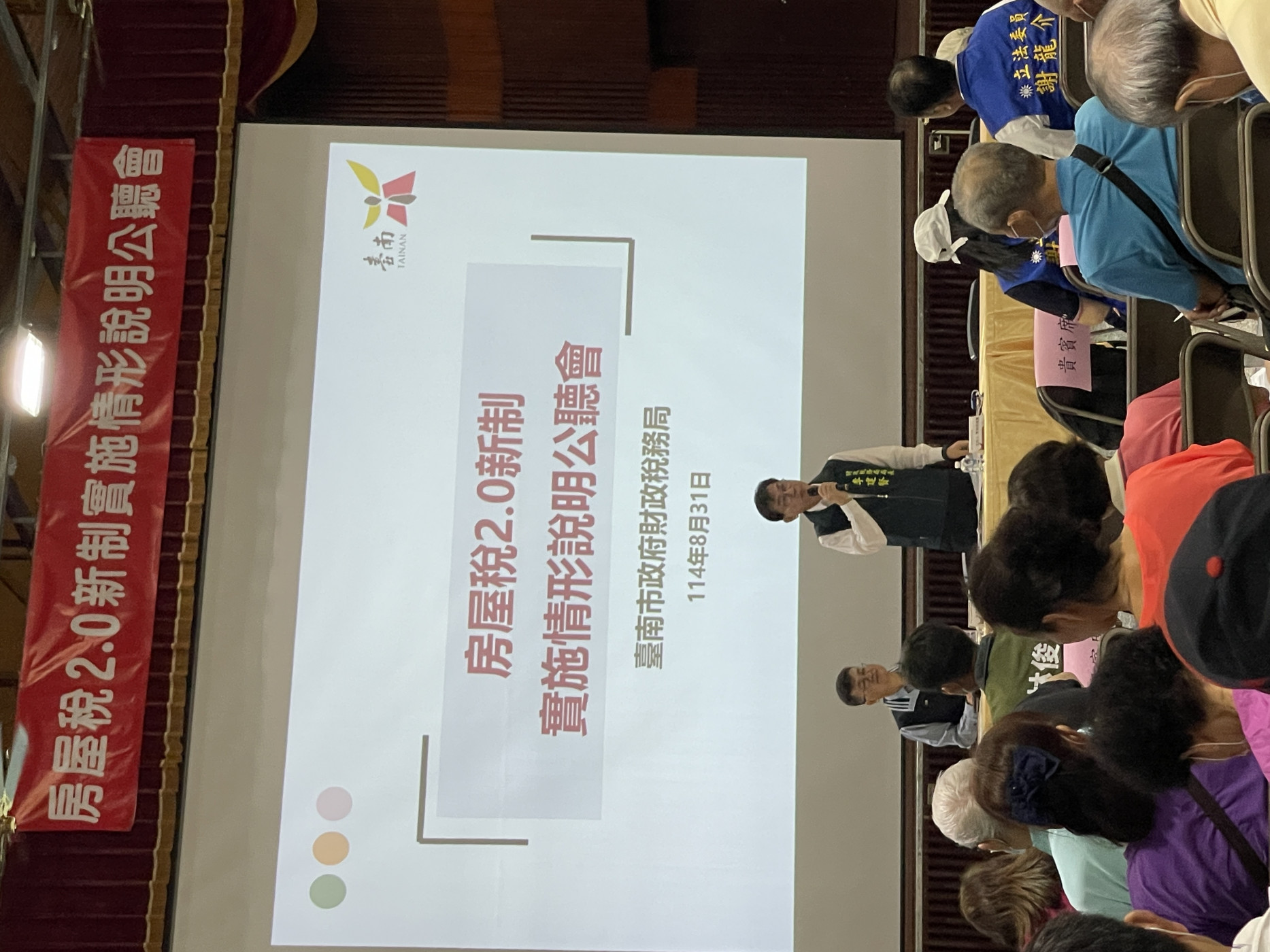 臺南市政府財政稅務局表示,今(114)年5月開徵的房屋稅是2.0新制實施的第一年,為協助市民廣泛了解房屋稅新制重點,也回應臺南市議會的要求,8月31日由財稅局局長李建賢主持,廣邀一般民眾、建商代表及自住房屋未設籍按一般非自住房屋課徵房屋稅之納稅人等相關人士,於民治市政中心南瀛堂辦理第一場公聽會。市議員李宗翰、沈家鳳、蔡育輝親自到場,立委林俊憲、陳亭妃、賴惠員、謝龍介及本市議員王宣貿、陳昆和亦派員與會,在地里長沈崑田、程崑藤、蔡崇名及里民也踴躍參與。公聽會中各界對於財稅局的簡報說明,積極且熱烈表達多元意見與想法,財稅局並承諾對於非自願性因素無法設籍適用自住房屋稅率的問題,將朝建議中央修法方向努力,充分達到公聽會雙向溝通與交流的目的,也讓本場公聽會在互動融洽的氣氛中順利完成。