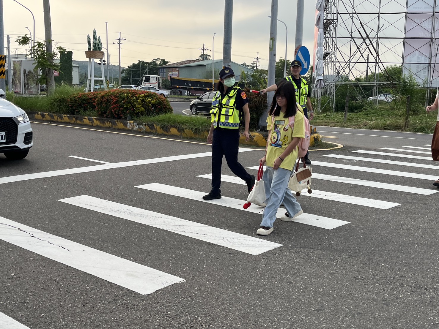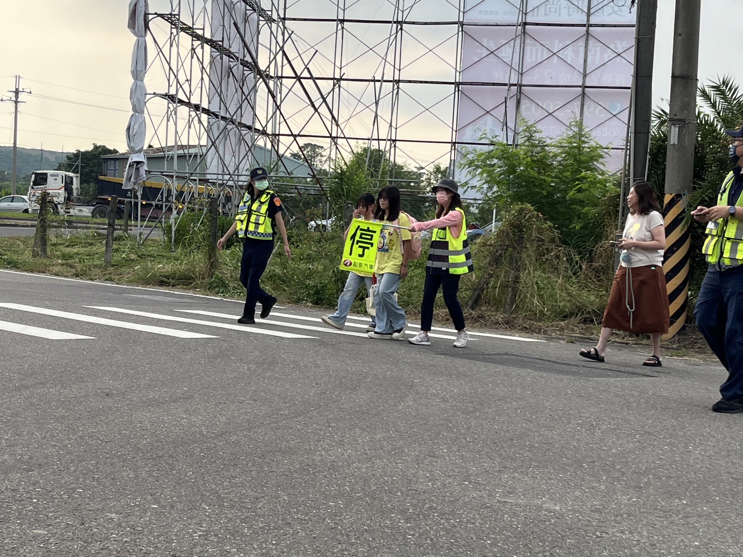 圖: 善化警分局員警及志工於開學日執行護童專案(記者田進山攝)