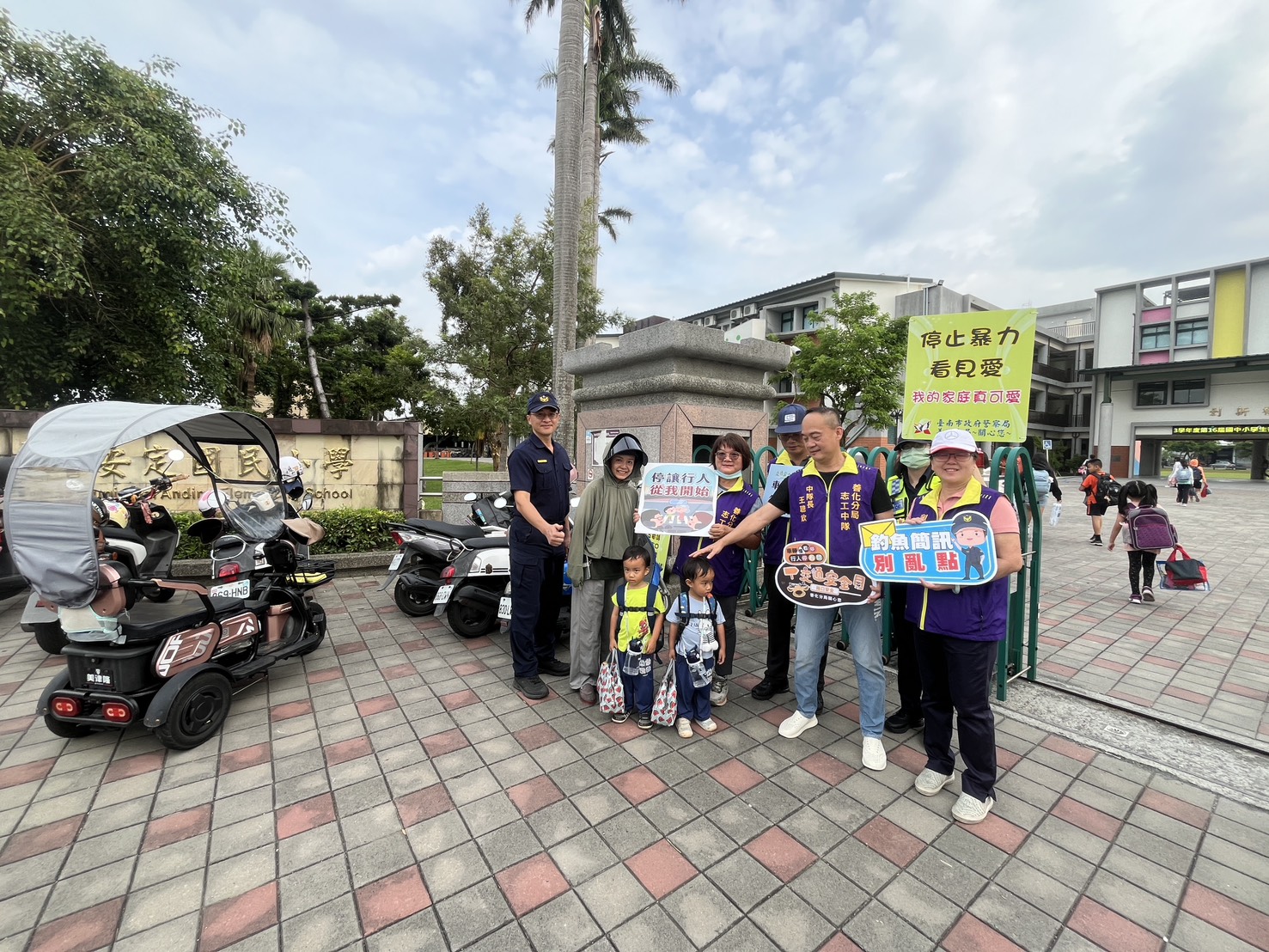 開學首日,善化警分局針對轄區內學童上學時段,配合校方派遣警力執行「護童勤務」,在有限的警力下,結合義交、義警、志工共同執行,加強維護學童上學的安全。除將警力規劃在最明顯的位置,針對學校附近周遭可能危害學童安全危險因子,如落單學童提供適時導引、加強側門無導護老師、志工之協助,以貫徹守護學童安全的決心,務期讓每一位家長對於幼童上學均能安心。執行護童勤務的同時,一併宣導婦幼、交通安全與防詐:傳達正確觀念,提升學童「自我安全保護觀念」,還有「保護自己身體自主權,任何人(包括熟人、親戚)都不得隨便觸摸」、「兒少性私密影像:『不拍攝』、『不持有』、『不上傳』」等正確安全觀念,並提醒學童過馬路時應遵守交通號誌,不可違規穿越道路,切勿嬉戲打鬧或低頭使用手機,並同時宣導腳踏車用路、禮讓行人規定及宣導常見詐騙手法並教導防詐小訣竅,倘接獲疑似詐騙訊息,不要慌張,牢記「1聽」、「2掛」、「3查證」口訣,並要記住報案電話110。