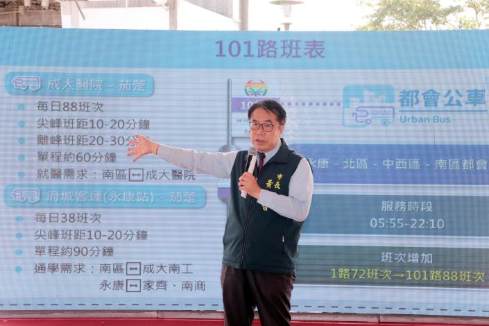 黃偉哲表示,101都會公車的通車,象徵市區公車路網重整邁入新階段。新路線以高運量、大型車輛與密集班次為特色,主要行駛於交通主要幹道,與生活公車、厝邊公車形成清楚分工,打造多層次的公共運輸服務網絡。