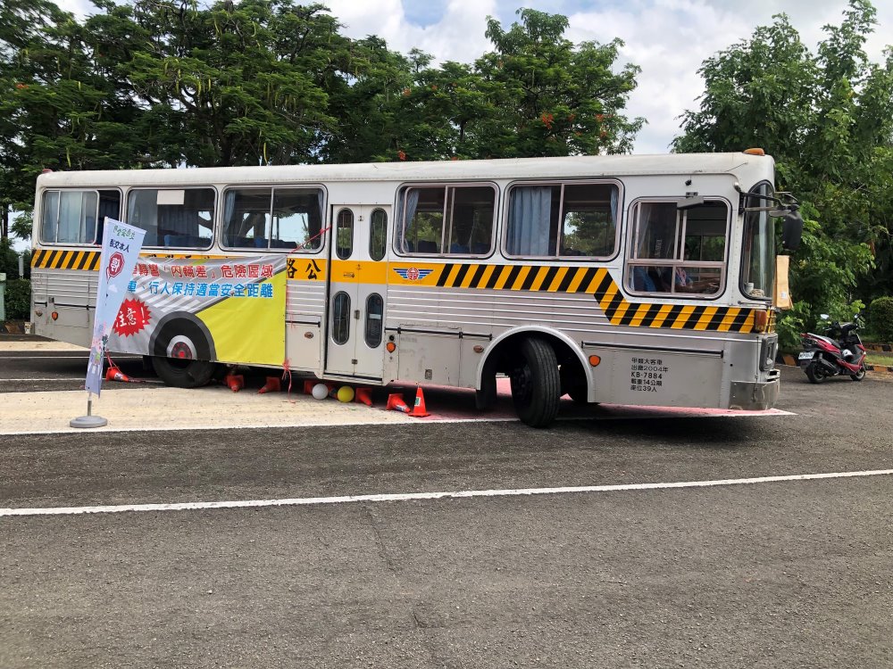 前進、過彎打方向燈(手勢)、轉向測試等關卡,從中導正錯誤及偏差之駕駛行為。再來進行大型車視野死角與內輪差實際體驗分享,加深對大型車視野死角與內輪差潛在的危險認知,並讓同學們分別登上駕駛座體驗,從不同角度去觀察大型車視野盲點區域,同學紛紛大聲驚呼「真的很大、看不到」,另外現場放置氣球及交通錐,模擬行人及機車,實際體驗緊臨大型車因內輪差可能衍生後果,只見車輪輾過氣球爆破聲頻傳,場面超嚇人。