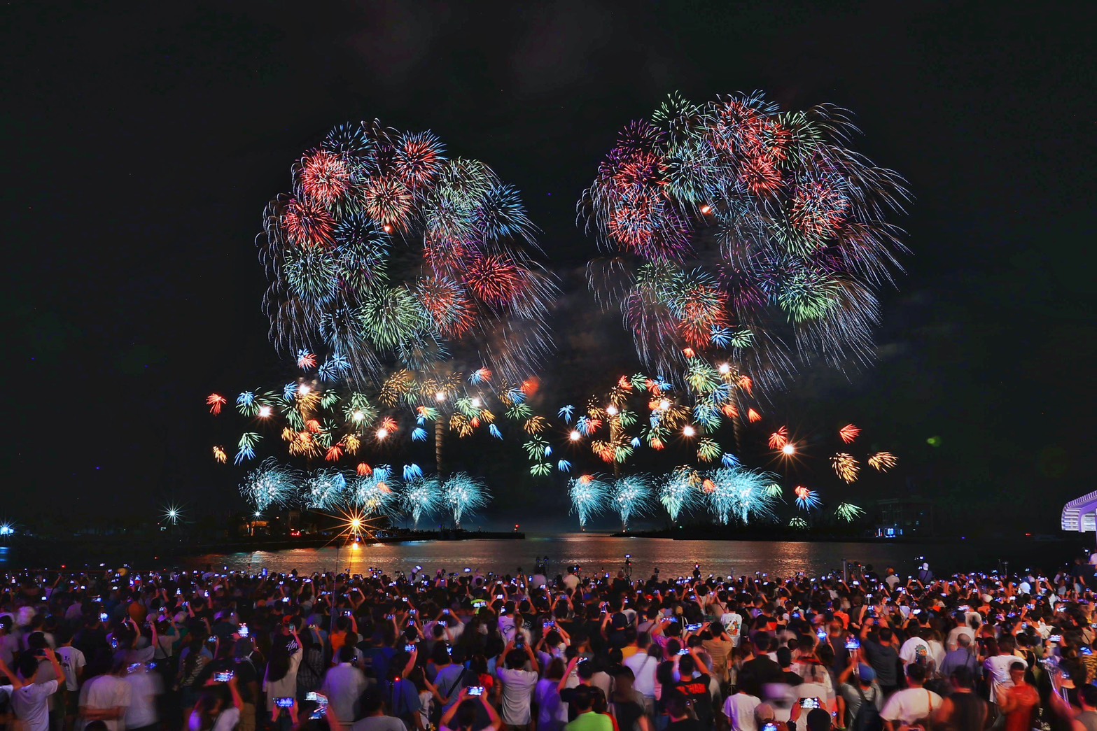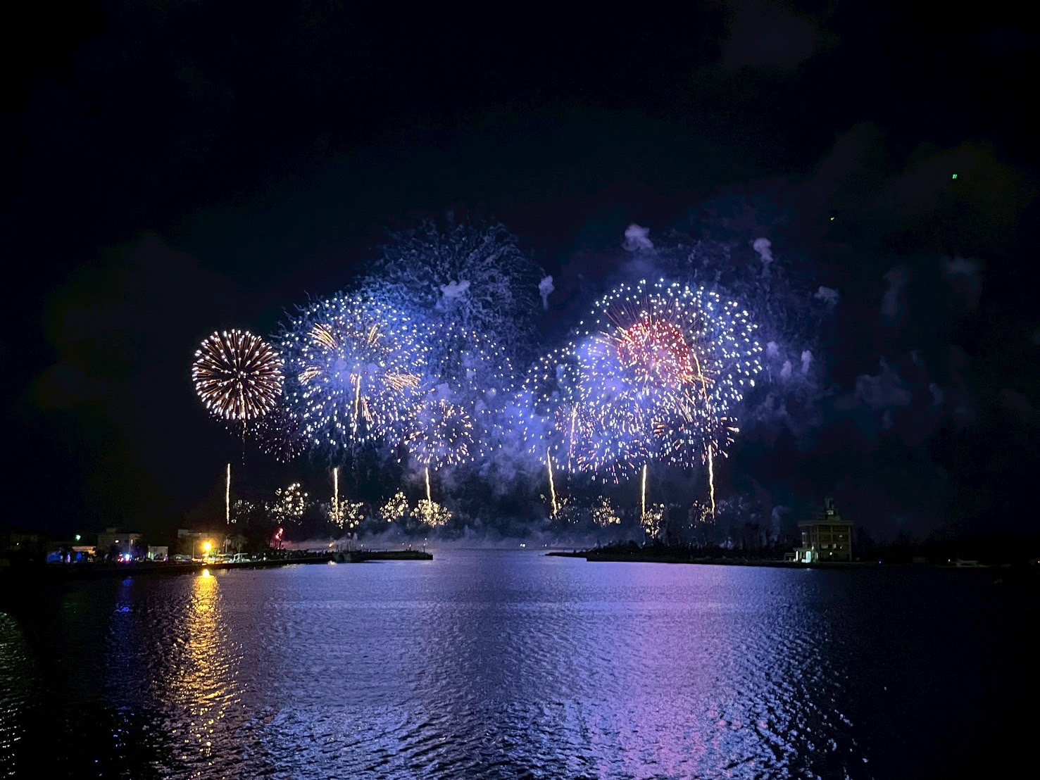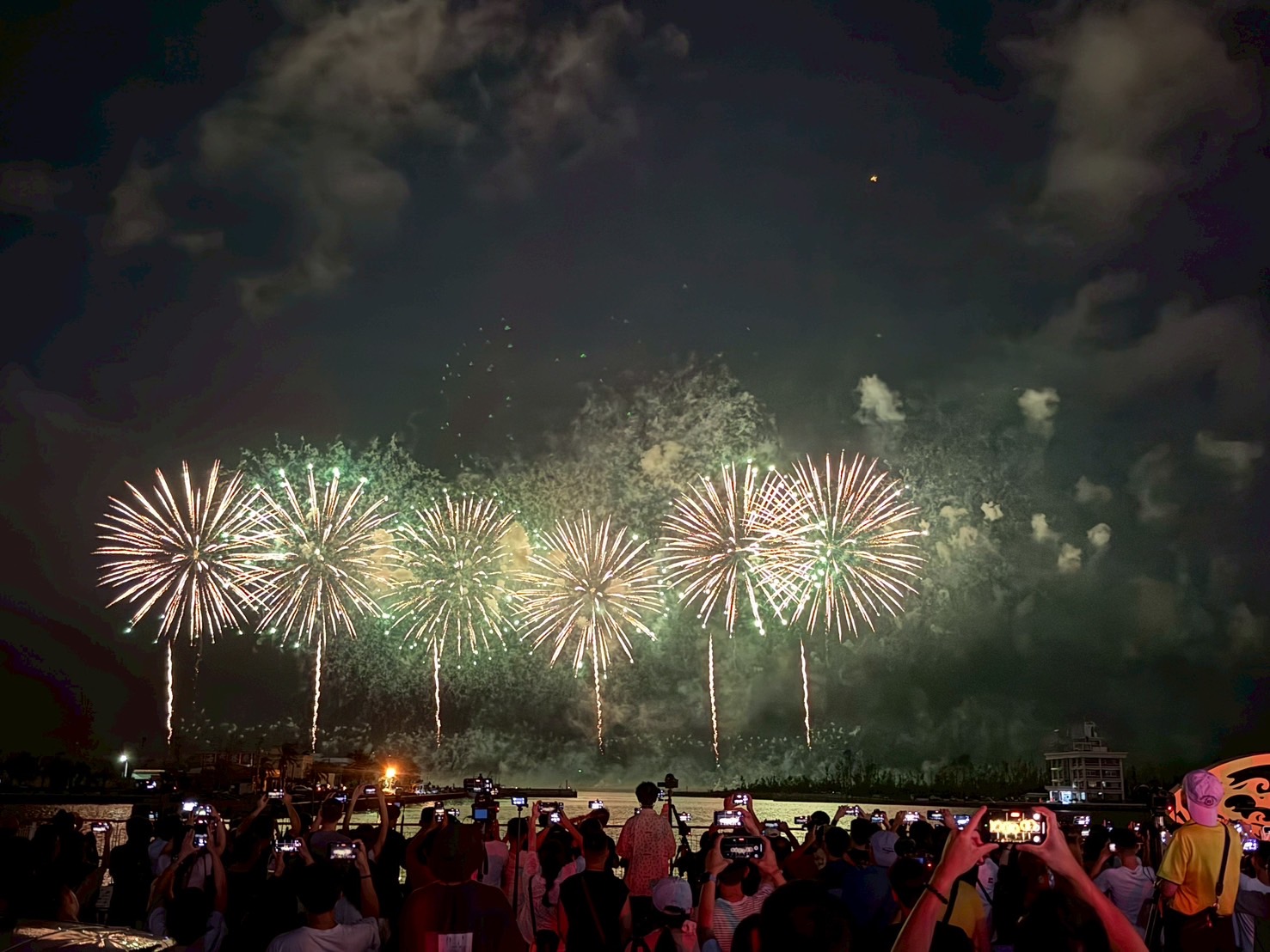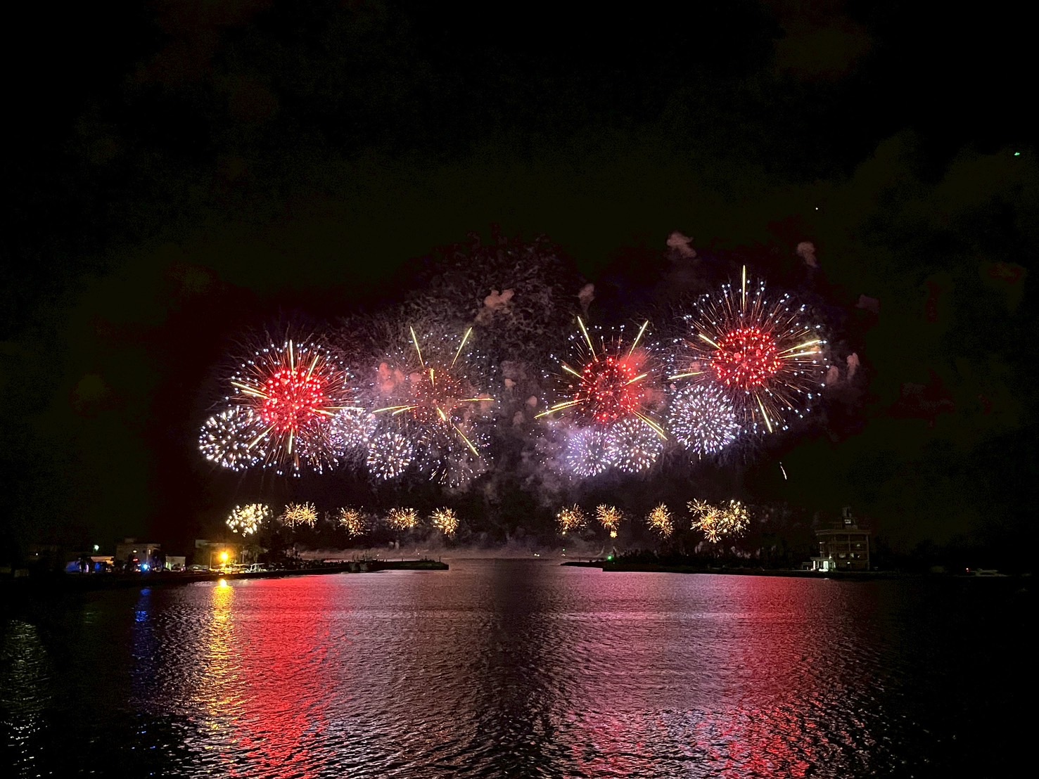 「將軍吼」第二天,首度在台南施放16吋彩色千輪煙火,點亮海港夜空