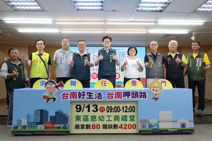 【記者楊朝欽/台南報導】超過4千個工作機會求才!台南市政府今年第3場「台南好生活 台南呷頭路」大型就業博覽會將於9/13上午9時至12時在東區慈幼高級工商職業學校辦理,今(9)日於永華市政中心舉辦記者會,副秘書長徐健麟代表市長黃偉哲與現場貴賓共同參加啟動儀式,鼓勵求職者來台南呷頭路,找到理想工作。