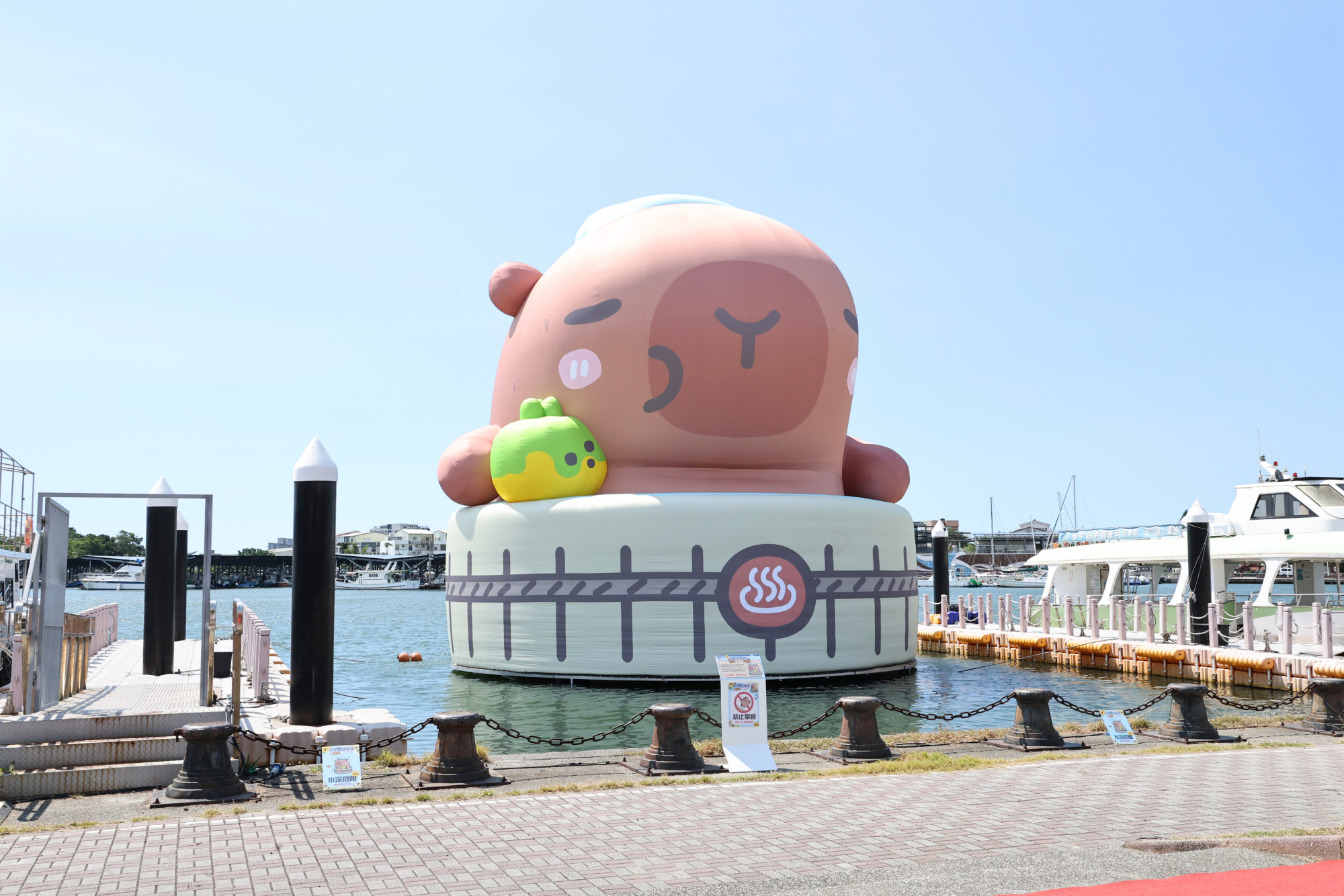 首次登陸安平漁人碼頭的12米高「卡比胖拉」,以經典慵懶泡湯造型現身,手抱青皮椪柑