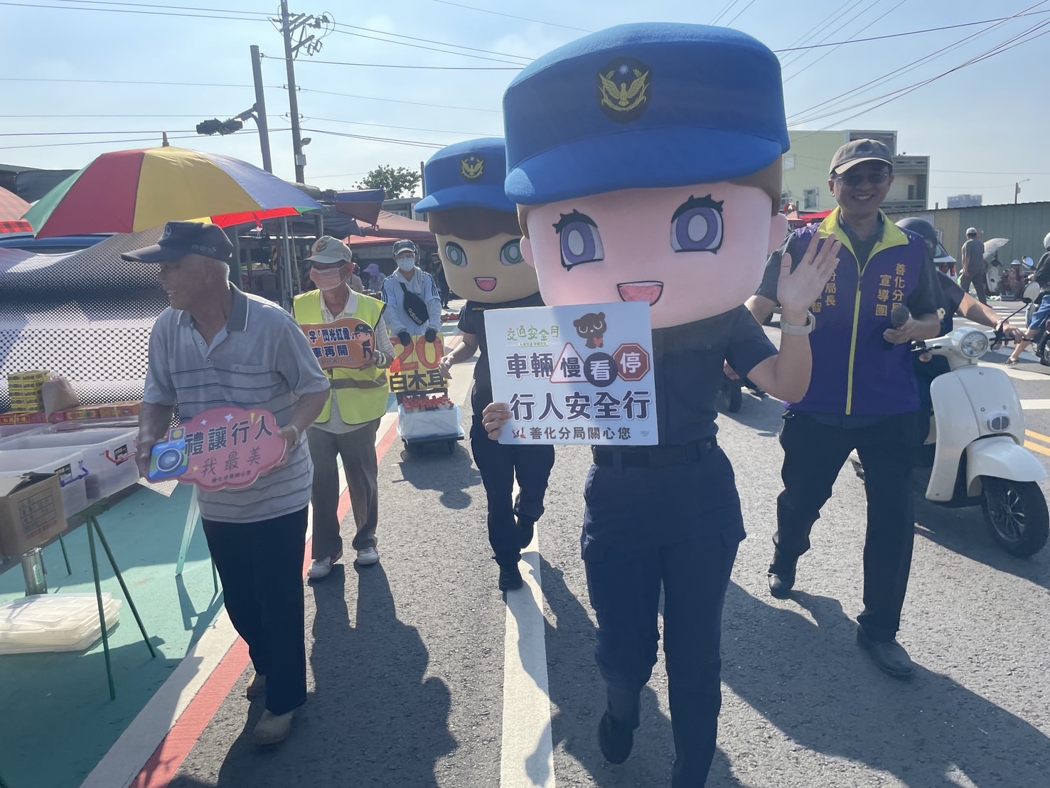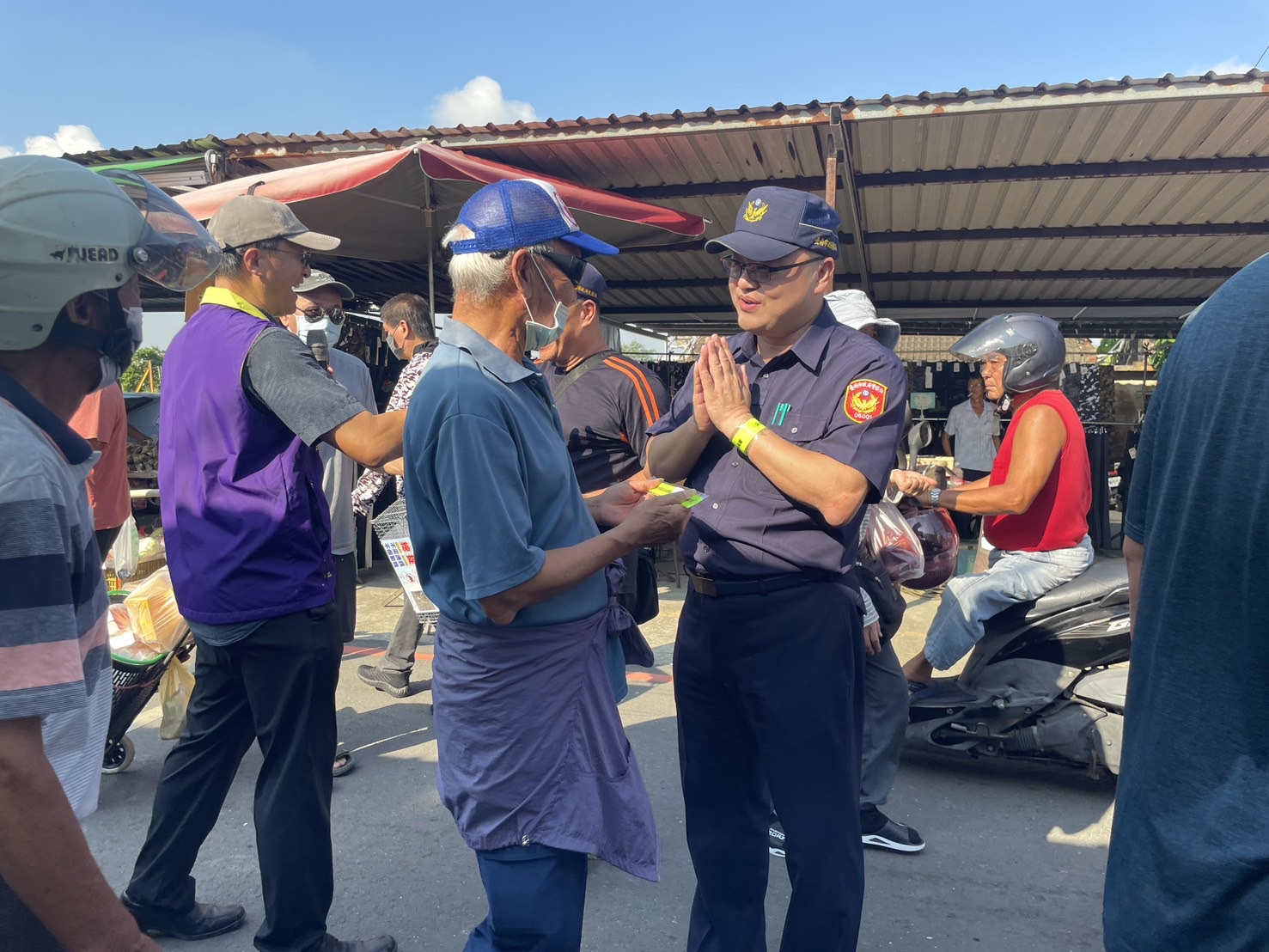 善化警分局特別結合在地特色「善化牛墟市集」,由分局長劉柏陞率領交通安全宣導團隊,邀請在地的什乃里長王榮勳及熱心的志工大姐們一同參與。