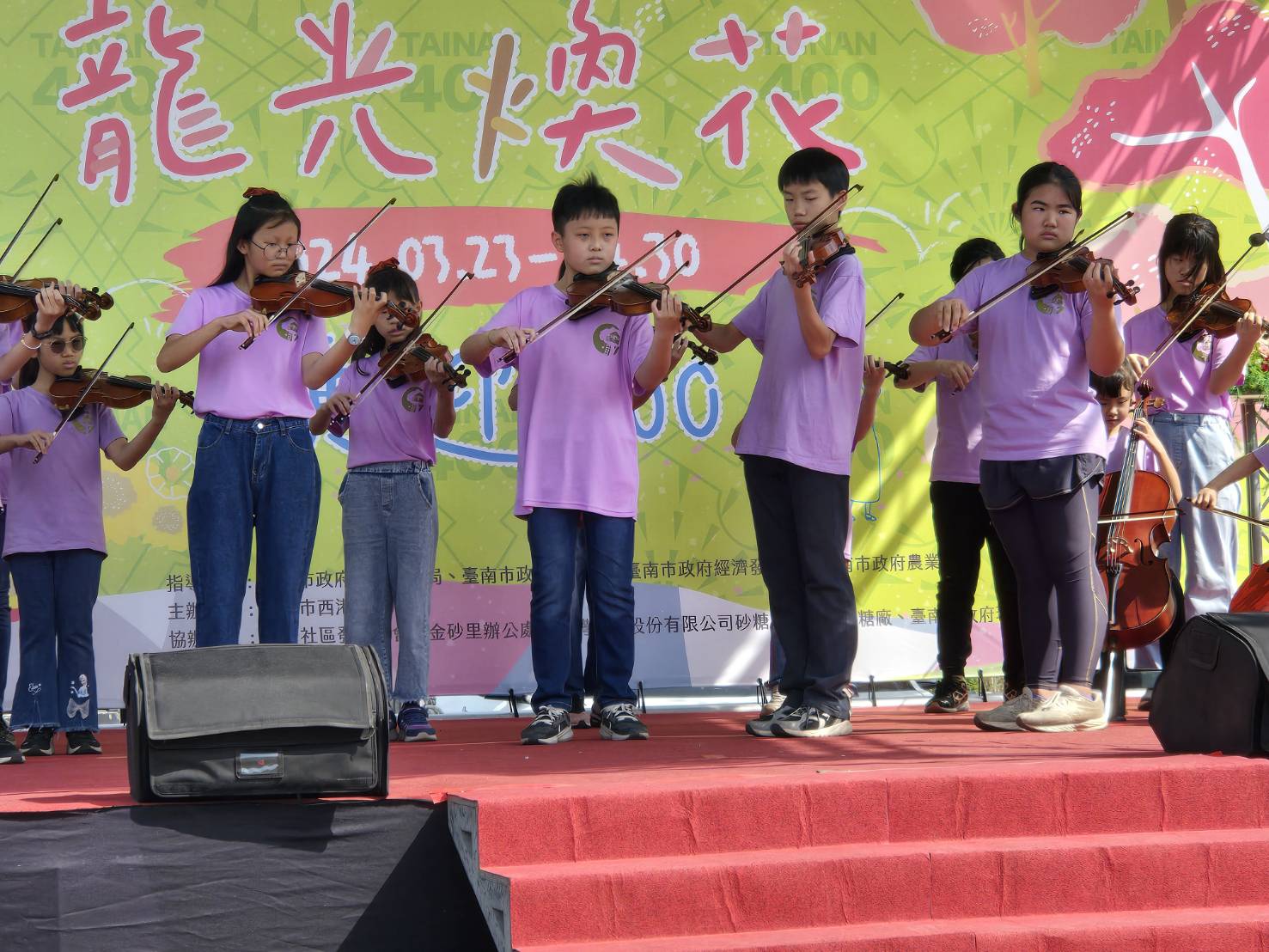 本日活動首由西港區松林國小表演小提琴演出,演奏「小城夏天」、「淚光閃閃」、「母親您真偉大」等樂曲,琴聲悠揚,令人聽得如癡如醉,西港區成功國小薩克斯風隊,不遑多讓,上場吹奏「甜蜜蜜」、「莊周一生夢一蝶」、「一笑江湖」等3首樂曲,旋律優美,曲風優雅,在花旗木下吹奏,令人聽得心曠神怡,流連忘返,受到熱烈掌聲。