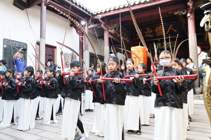 祭奠禮樂生由台南文廟以成書院院生擔任,六佾舞則由永福國小41位學童演出,佾生在學校老師及廟方引領下,行迎神禮表達對武聖的敬意。典禮結束後,市長黃偉哲特別頒發佾生證予學童並合影,讓參與的小朋友留下快樂回憶。