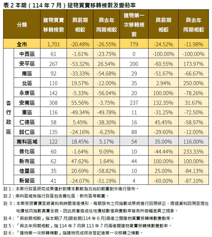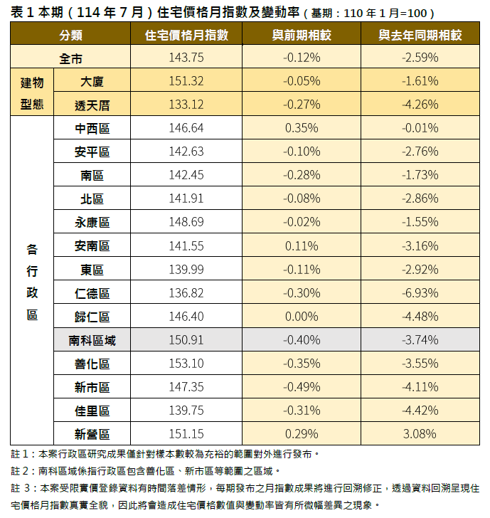 臺南市114年7月住宅價格指數微幅下降0.12%,進入價量齊跌整理格局。