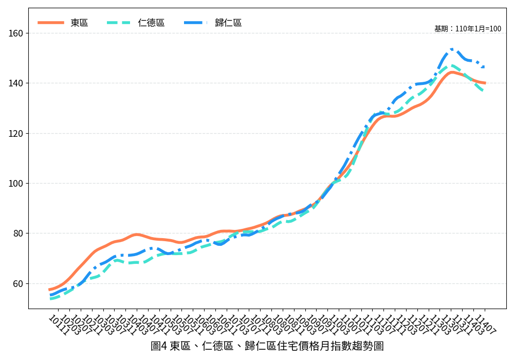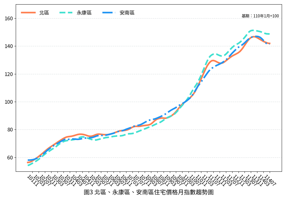 整體而言,本期臺南住宅市場進入價量齊跌整理格局。各行政區因重大開發計畫推進與新建案完工時程不同,房價表現漲跌互見。全國景氣指標仍屬穩定態勢未來市場走向仍面臨諸多不確定因素,購屋者宜審慎評估風險,保守因應。有關詳細住宅價格指數資訊,將公佈於本府地政局網站。