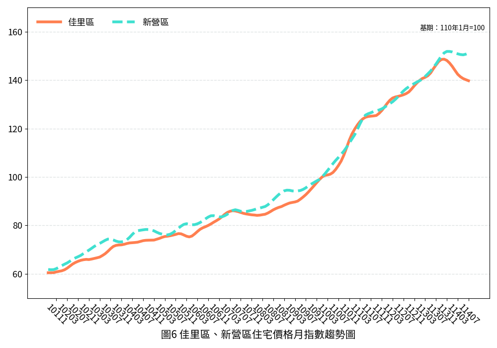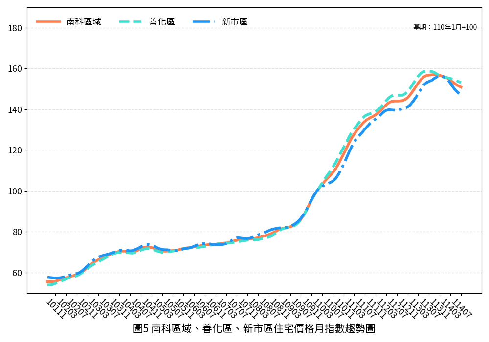 進一步觀察各行政區的住宅價格指數表現,多數行政區價格指數較前期相較呈現微幅下跌,其中以新市區的月跌幅最高,較前期微幅下跌0.49%,其次為善化區以及佳里區,月跌幅均較前期分別微幅下降0.35%及0.31%;此外,仍可觀察到部分行政區月變動率維持於正成長,如中西區、新營區及安南區,月漲幅分別為微幅上漲0.35%、0.29%及0.11%。若與去年同期比較,僅新營區微幅上漲3.08%,其他行政區皆呈下跌走勢。觀察本期住宅價格指數,相較於前期,多數行政區價格仍呈現修正格局,反映出在房貸政策持續緊縮與第七波信用管制影響下,購屋族群的資金取得不易,進一步壓抑價格表現。短期內,受政策變化影響,房價仍面臨下行壓力。
