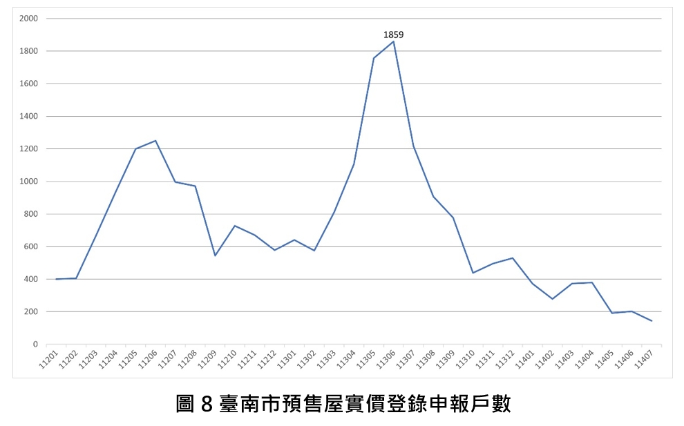 進一步觀察各行政區交易量表現,交易量前三名分別為安南區(308棟)、安平區(267棟)以及永康區(142棟)。與去年同期相比,安平區增幅最為顯著,本期交易量增加26.54%,其中安平區因區內新建案陸續完工後,第一次移轉登記的案量較去年同期大幅增加,本期第一次移轉棟數為200棟。相比之下,佳里區、永康區以及南區交易量皆下跌逾5成。再觀察本市預售屋實價登錄申報件數113年7月起已呈現逐步下修量縮態勢,本期與去年同期(113年7月)相比下降88%。後續仍需關注政策走向及國際經濟情勢的變化,將成為買方進場意願及資金流動的關鍵影響因子。
