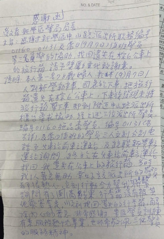 圖:民眾回憶起此事特地手寫書信寄至警局感謝熱心幫忙的員警。