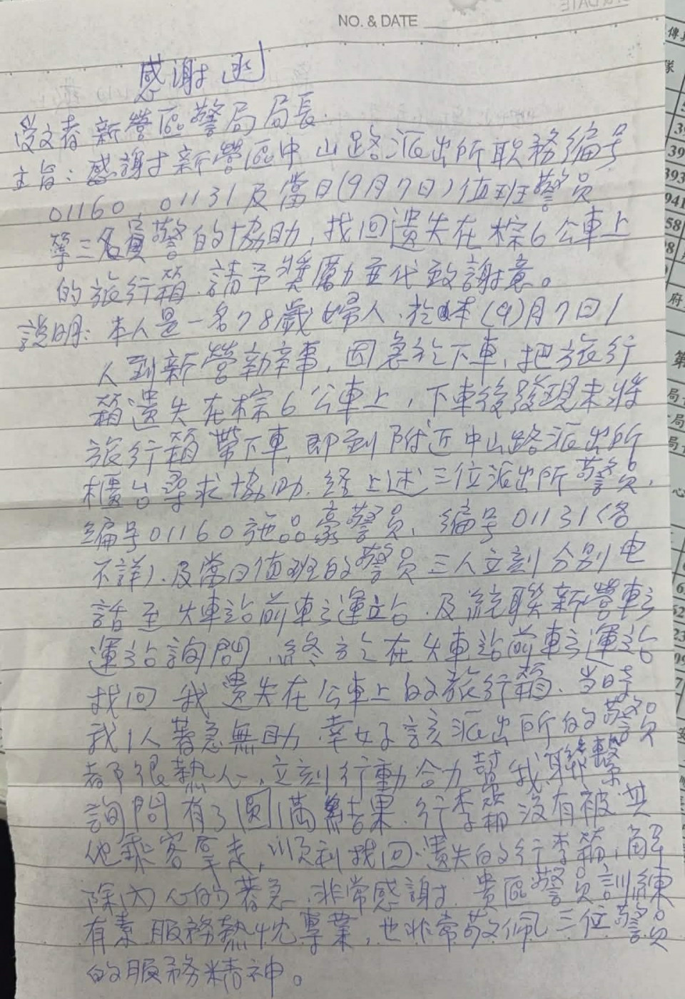 這封感謝信函係一位署名78歲高齡婦人,信中自述其於114年9月7日14時10分因處理事務至本市新營區搭乘本市棕6線公車客運巴士,接續婦人於新營火車站因急於下車而把行李箱遺忘在公車上,婦人發覺後公車已駛離,婦人只能焦急地至鄰近之中山路派出所請求協助,當時段備勤警員施品豪立即致電新營火車站詢問是否有拾獲特徵相符之行李箱,另巡邏員警陳其鴻及楊勝閎等2員亦旋即至新營火車站旁轉運站及統聯新營轉運站尋找該行李箱,不久後即在新營火車站旁轉運站找回該行李箱交還婦人,婦人行李箱失而復得,非常感謝員警的幫忙,返回新北市後回憶起此事特地手寫感謝信函稱許施、陳及楊等3員。