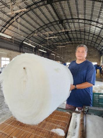 蔡順龍說,手工被舒適耐用的關鍵在於鋪棉,要縱橫交錯、中間厚四邊薄,才能貼合人體,達到保暖效果。只見他拿著有如巨大棉花糖的棉捲,輕輕轉動拉甩,一手拿竹條拍打壓實使棉花平整,最後收邊,看似輕盈俐落、一氣呵成,卻需要巧勁與技術。他說,早期全靠手打棉花,夫妻一整天只能做兩床被子。現在儘管有梳棉機輔助,但紮實工序仍然耗時費力,一天三人頂多能做20件手工被。尤其棉絮漫天飛舞,廠裡不能裝冷氣和開電扇,夏季室溫高達38度,得揮汗工作,非常辛苦。