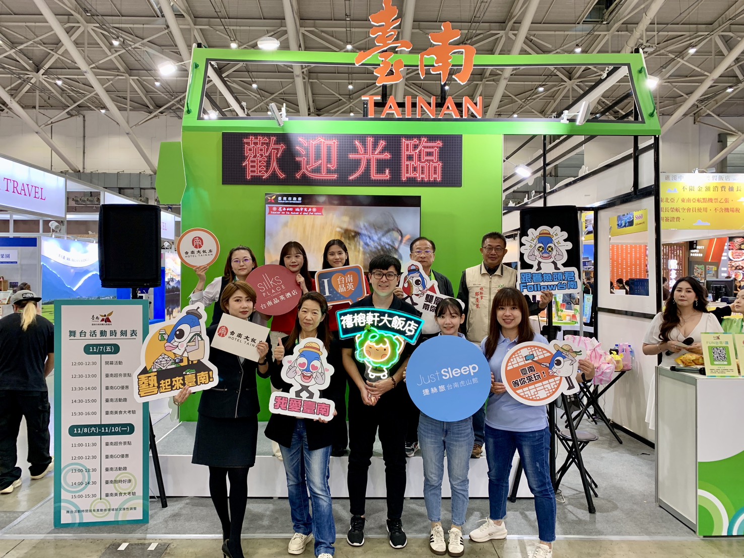 觀光旅遊局林國華局長表示,旅展期間臺南館也推出消費滿額活動,民眾只要於臺南館消費滿500元即可參加「臺南滿額轉好禮」活動,就有機會獲得瓜瓜園原味地瓜脆片、八家將乖乖、純素蕎麥脆果菓等好禮;參加「FUN台南!讚」活動就送臺南限量銅錢餅;參加「限時按讚」活動限量好禮抽,每日抽出限量魚頭君U型記憶枕及椪餅,上述贈品數量有限,送完為止。每日現場也有豐富多元的舞台活動及產業推廣,眾多舞台活動小遊戲等你來挑戰,活動詳情可至臺南館服務台洽詢。
