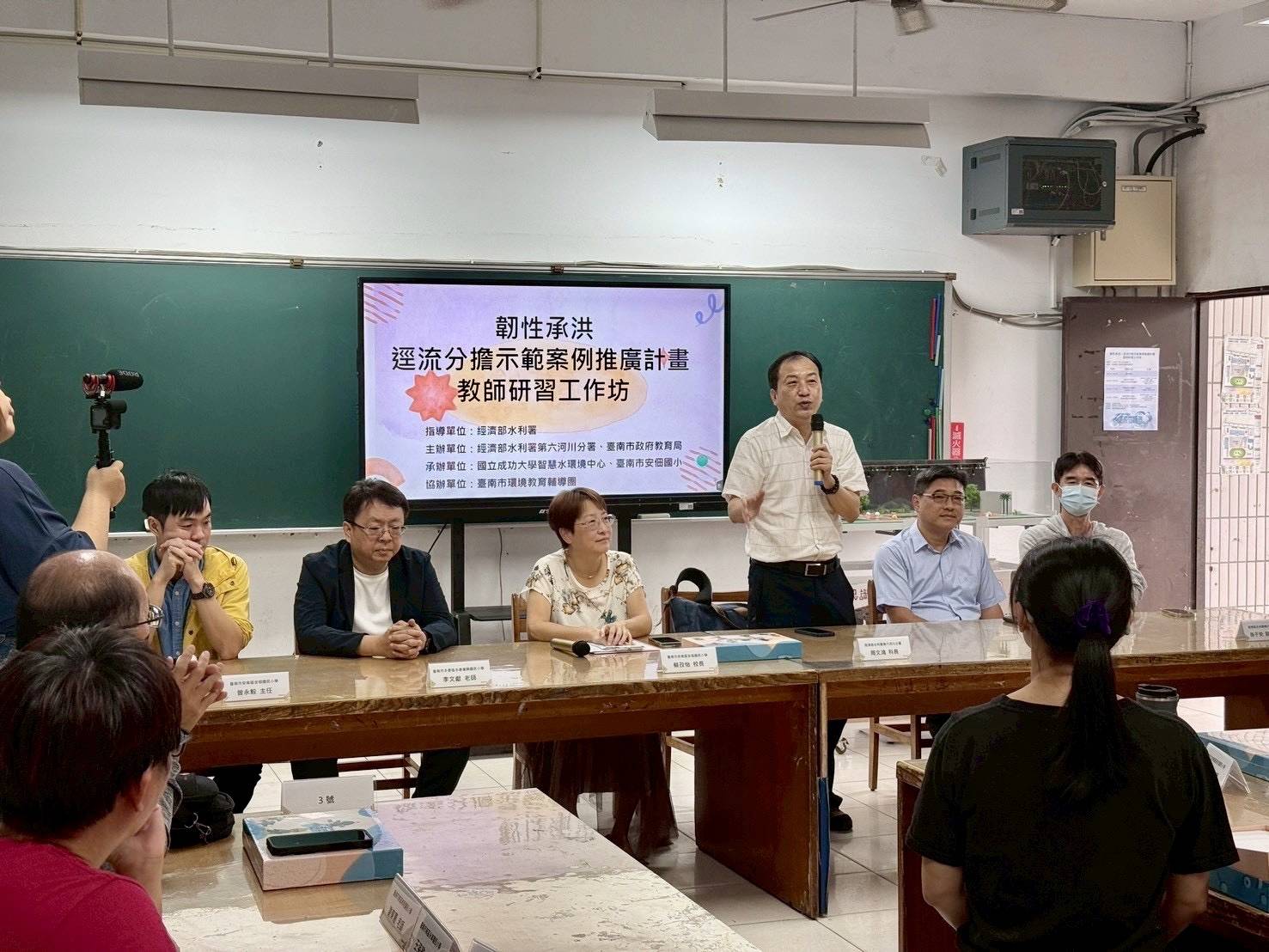 【記者黃石泉/台南報導】面對極端氣候導致的瞬間強降雨與都市淹水風險日增,校園防洪教育與氣候調適議題備受重視,經濟部水利署第六河川分署今日於臺南市安南區安佃國小辦理「韌性防洪逕流分擔-《逕流守護者》教師研習工作坊」,並由國立成功大學曾志民教授帶領成大智慧水環境研究中心及臺南市環境教育輔導團共同協辦,透過課室示範活動,搭配動畫、模型及桌遊等,推動防洪教育向下扎根,深化校園氣候韌性。