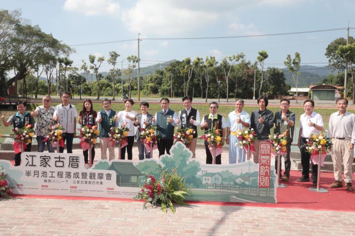 整治後的半月池重現鹿陶洋景致,市府今(15)日舉辦「江家古厝半月池工程落成暨觀摩會」及「楠得CHILL一下‧江家古厝秋日市集」,邀請民眾走讀聚落故事,並順道選購在地商品,市長黃偉哲也親自到場為活動揭幕。