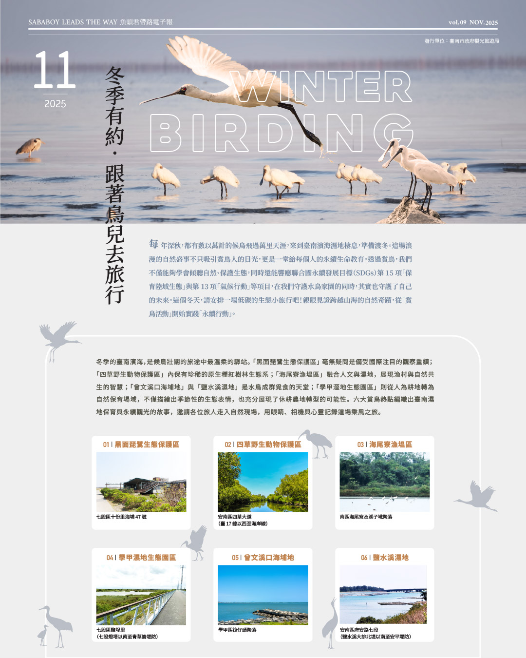 南市觀旅局林國華局長表示,11月號的《魚頭君帶路》推出「冬季有約·跟著鳥兒去旅行」主題,介紹六處臺南濱海受黑面琵鷺青睞、作為渡冬棲息、可近距離觀賞黑面琵鷺的熱門地點,並提供六個大臺南濱海賞鳥亭給想要前往的旅人作行程規畫參考。