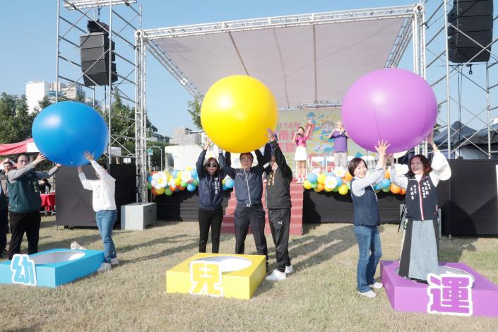 【記者黃石泉/台南報導】2025台南幼兒運動會首場活動,今(22)日在永華市政中心西側廣場熱鬧登場,共有67隊、955位小朋友及家長齊聚同樂。台南市長黃偉哲親自出席,並與大小朋友合作「大球傳遞」揭開序幕,現場歡笑聲不斷,他也鼓勵親子多培養運動習慣,在競賽中享受運動的樂趣。