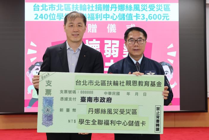 黃偉哲表示,感謝台北市北區扶輪社親恩慈善基金對台南風災受災學生的關懷與捐助。丹娜絲颱風造成台南中南部地區嚴重損害,即便政府已做好防災準備,仍難以完全避免天災帶來的影響。