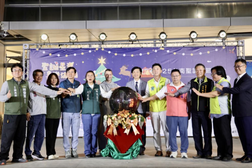 【記者王榮輝/台南報導】「2025台南聖誕燈節—新營文化中心暨綠川廊道燈區」昨(6)日正式點燈,由副市長葉澤山代表市長黃偉哲主持點燈儀式,偕天主教台南總鐸長梁承恩神父及各界來賓一同點亮聖誕樹,與市民朋友迎接聖誕佳節的到來。