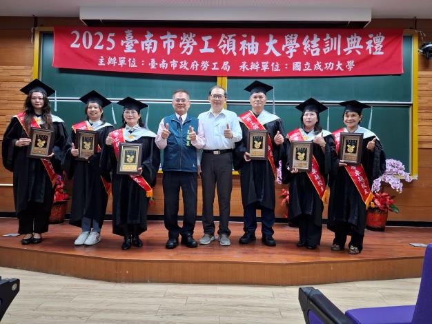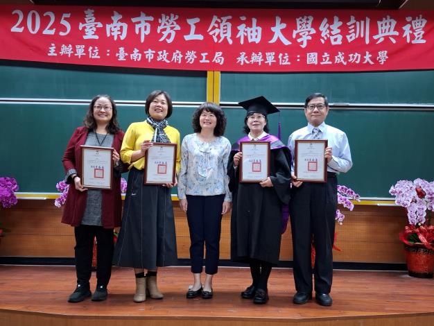 【記者楊朝欽/台南報導】為建構黃偉哲市長「希望家園」的施政願景,勞工局與國立成功大學合作辦理「勞工領袖大學」階梯式學習課程,昨(6)日於國立成功大學成功校區小格致廳舉行結訓典禮,國立成功大學教務長沈聖智、勞工局長王鑫基、主任秘書陳美顏、職訓就服中心主任梁偉玲及社團法人臺南市勞工領袖協進會陳美靜常務監事等人皆到場祝福並頒發學員結訓證書、心得分享獎、全勤獎及勤學獎等。
