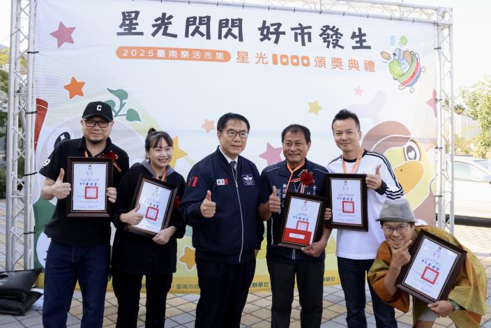 【記者黃雅愉/台南報導】台南市今(114)年在有「菜市場金馬獎」美譽的「經濟部優良市集暨樂活名攤評核計畫」勇奪1128顆星。台南市政府特別在今(8)日舉辦「2025台南樂活市集星光1000頒獎典禮」,由市長黃偉哲親自頒獎給連續三年蟬聯五星市集的花園夜市,以及今年加入五星行列的西門淺草青春新天地等名攤代表,與會者也齊聲高喊「星光1000、好市發生」,現場氣氛熱鬧。
