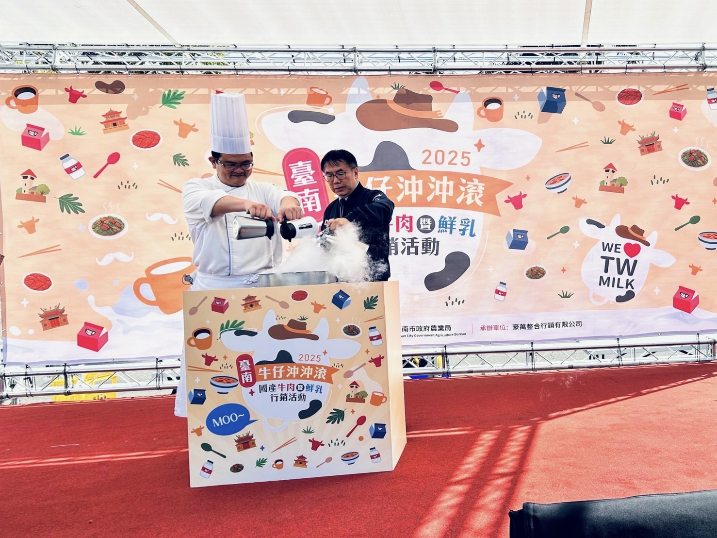 【記者田進山/台南報導】「2025牛仔沖沖滾—國產牛肉暨鮮乳行銷活動」今(14)日在善化啤酒廠熱鬧登場,濃醇鮮乳與現切溫體牛肉香氣四溢,吸引上千名民眾共襄盛舉。現場集結多家牛肉湯名店與豐富畜產市集,讓民眾一邊品嚐臺南特色美食,一邊享受結合農產、文化與歡樂的週末盛典。