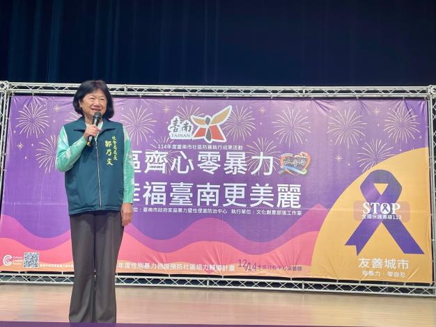 【記者田進山/台南報導】為普及對家庭暴力及性別暴力議題的認識與敏感度,南市社會局今(14)日假永康區社教中心演藝廳舉辦「社區齊心零暴力,幸福臺南更美麗」社區防暴成果展,邀集全市22個參與性別暴力防治社區服務方案計畫的社區組織共同參與。社會局郭乃文局長代表黃偉哲市長到場頒發獎狀,感謝社區夥伴的協力付出。