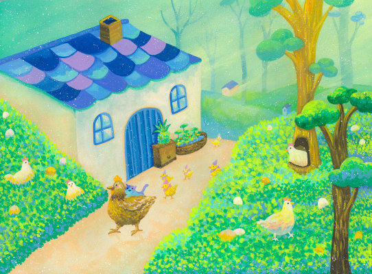 Nyumori的作品《自由森林》,則源自日本雞隻自然牧養的理念。畫面中,雞群在森林裡自在漫步、自由下蛋,享受陽光灑落的日光浴,呈現一種尊重生命本能、回歸自然節奏的理想狀態,也呼應展覽對永續農業與動物友善的關注。