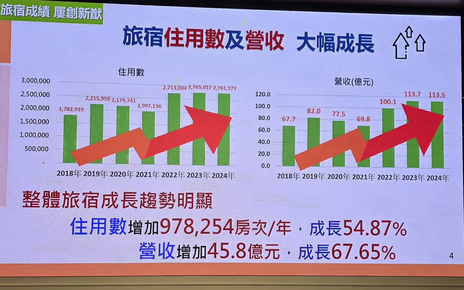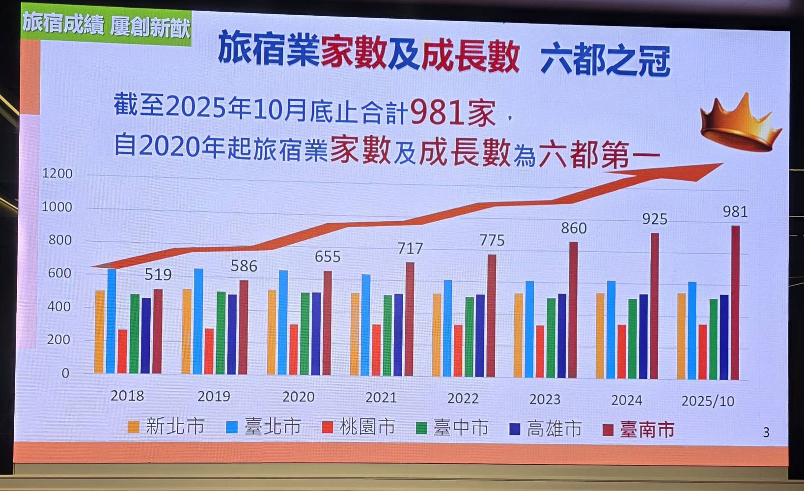 臺南旅宿業成績亮眼,2020年起旅宿業家數及成長數皆為六都第一。截至2025年10月底,旅宿業合計981家,史上新高,勇奪六都之冠。旅宿住用數及營收大幅成長,2018年至2024年住用數增加97萬8,254房次/年,成長54.87%,營收增加45.8億元,成長67.65%。另多家指標性業者插旗臺南,再創新里程碑,如福泰飯店集團與希爾頓酒店集團攜手合作,打造東亞首間高端品牌「Signia by Hilton」酒店,預計2026年開幕營運。福爾摩沙遊艇酒店及禧榕軒大飯店,今年雙雙榮獲五星級認證,旅宿品牌再升級。推動「性別友善旅宿認證」36家、「民宿經營公約標章認證」33家及「露營場標示牌認證」13家,打造安全永續友善旅宿環境。