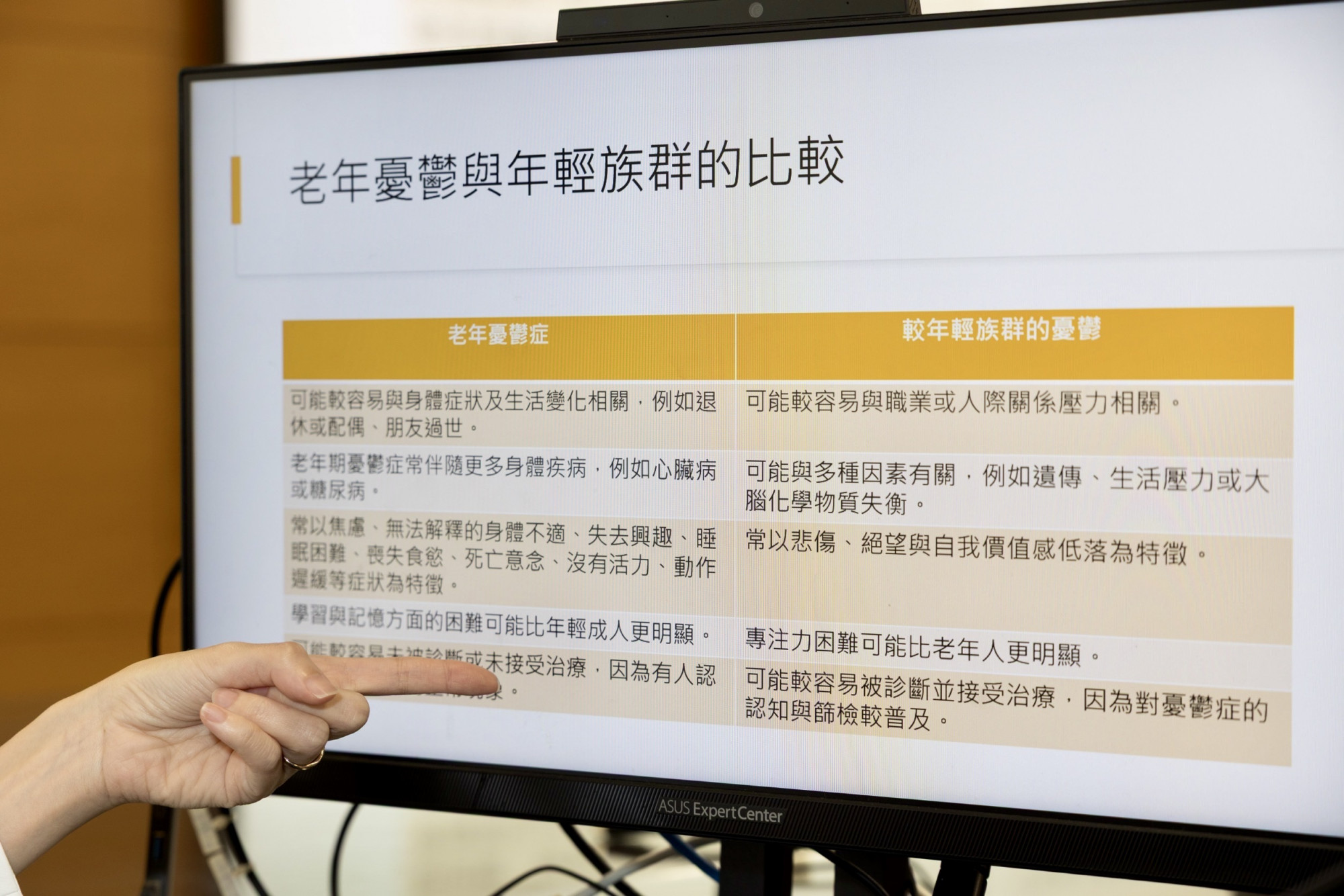 李佳寧醫師指出,老年憂鬱的症狀包括持續悲傷、焦慮或空虛的情緒,對過去感興趣的事物失去熱情,精力下降或容易疲倦,行動或說話速度變慢,專注力下降、記憶力變差或難以做決定,負向思考,睡眠困難,食慾欠佳等表現。長者的憂鬱症有時不容易察覺,部分長者不以悲傷為主要表現,而是感到情緒麻木、對事物失去興趣,或較少主動表達自身的感受;也可能以身體症狀呈現,例如身體疼痛、頭痛、全身無力或消化不適等情形。