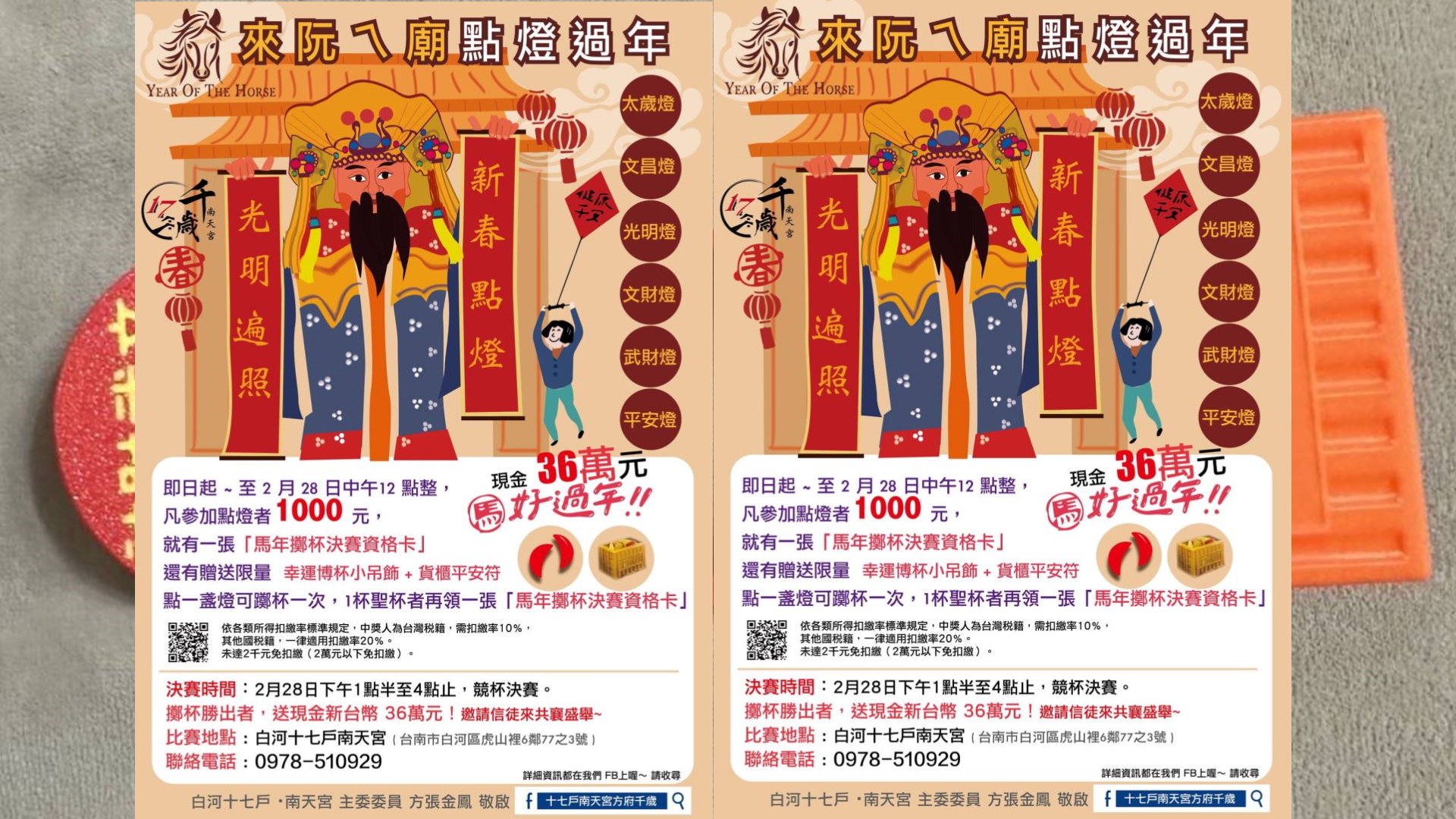 白河十七戶南天宮即日受理點燈贈好禮並可參加擲杯賽獨得36萬
