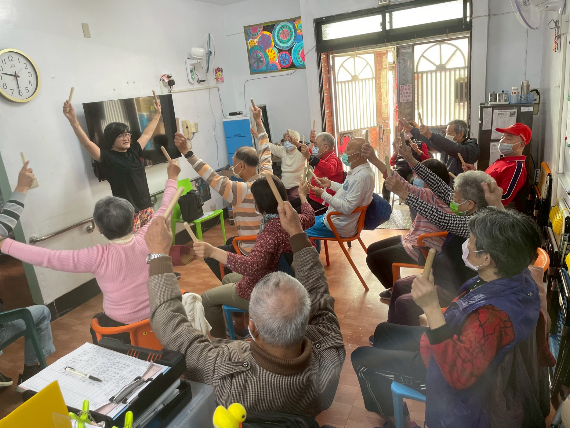 圖:運動指導員張慧平老師教導「抬膝、踮腳、分段引導」等趣味動作(記者田進山攝)
