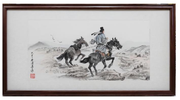 秘書處表示,本次展覽中,水墨畫作《筆墨所至,心馳神往》採寫意筆法,以簡練筆墨勾勒騎士策馬奔馳的動感畫面;馬匹用濃墨揮灑,筆觸豪放有力,充分展現奔騰的速度感;背景以淡墨渲染遠山曠野,營造遼闊蒼茫的氛圍。構圖疏朗有致,留白得當,體現中國畫「計白當黑」的美學理念。書法作品歐陽修《豐樂亭遊春》之「紅樹青山日欲斜」,字體端莊、結構嚴謹,筆畫橫平豎直、點劃分明。布局採傳統豎排右起形式,行氣流暢、章法整齊,整體呈現中國傳統書法藝術之美。