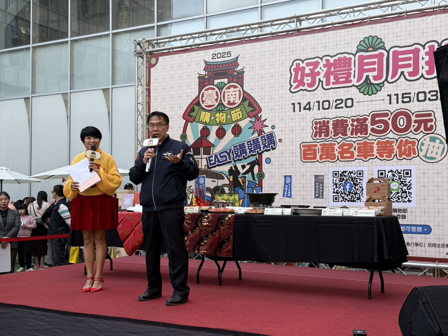 【記者黃石泉/台南報導】台南購物節1月首場主題活動今 (4) 日在南紡購物中心熱鬧登場,以傳統市場年菜推廣為主軸,結合市集展售與互動活動,提前為農曆春節暖身。市長黃偉哲親自到場,推薦來自仁德、文華市場等外帶年菜組合以及多家飯店業者精心推出的特色年菜,邀請市民朋友以實際行動支持,把澎湃又充滿人情味的年味一次帶回家。活動現場設有熱鬧市集並同步展示多款市場年菜組合,同時為慶祝臺南購物節突破50億大關,市長黃偉哲當場加碼宣布推出市場專屬「2萬元加菜金」抽獎活動。