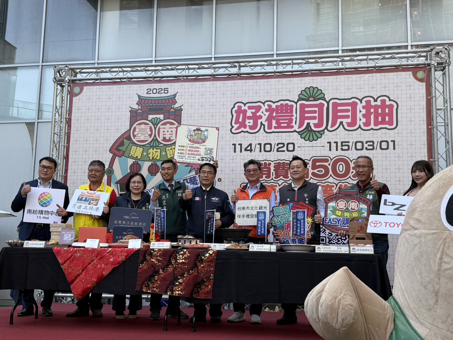 臺南購物節買氣持續升溫,消費登錄金額迄今已突破50億元,黃偉哲市長驚喜宣布臺南購物節再加碼!他表示,市府特別結合數位行銷券推出加碼抽獎活動,只要在活動期間到臺南公有零售市場消費,就有機會抽中2萬元「加菜金」。活動現場氣氛熱鬧非凡,萌翻眾人的臺南購物節吉祥物「菜奇鴨」與「夜奇鴨」也現身與民眾同樂、帶動現場歡笑聲不斷;同時現場展示膨湃實惠的仁德公有市場及文華市場年菜好禮,以及多款飯店精選年菜,讓民眾一次看好、選好,把滿滿年味帶回家。