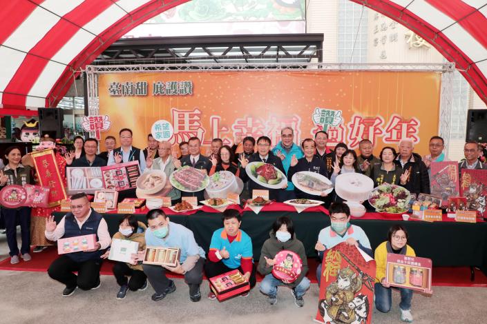 【記者田進山/台南報導】台南市政府勞工局今(7)日於官田區農會超市前廣場辦理「馬上幸福過好年—台南庇護年節禮」行銷記者會,攜手7家庇護工場,推出多款精美年節禮盒與開運年菜。台南市長黃偉哲、勞動部勞動力發展署雲嘉南分署副分署長許慧香及五大總工會代表皆親自出席,呼籲社會大眾共同守護弱勢就業,以實際行動訂購支持,傳遞溫暖與愛。