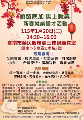 115/1/20(二)南市勞工局職訓就服中心辦理『頭路底加 馬上就業』新春就業徵才活動