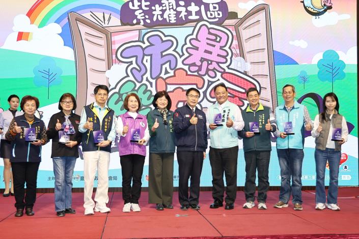 【記者田進山/台南報導】台南市社會局今(13)日於福爾摩沙遊艇酒店舉辦「社區防暴有功人員表揚大會」,現場有350位來自在地社區組織、志工團體及網絡團隊的宣導人員共同響應。黃偉哲市長率領各單位代表一起轉動南市防暴精神堡壘,象徵公私部門齊力推動反暴力的決心,市長並頒發獎牌予54組宣導團隊,感謝他們深耕社區及肯定多年來投入家庭暴力、兒少保護與性侵害、性騷擾等初級預防工作,也希望藉此吸引更多民間組織及社區民眾共同參與。巿議員王家貞、沈震東、林美燕本人及多位議員服務處代表亦到場參與。