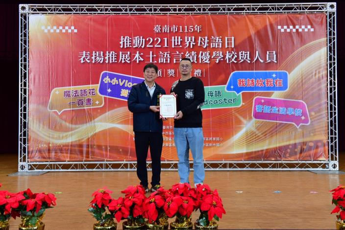 【記者楊朝欽/台南報導】為響應世界母語日,臺南市政府教育局21日於中西區協進國小隆重舉辦「臺南市115年推動221世界母語日表揚推展本土語言績優學校與人員頒獎典禮」,表揚在母語推動上表現優異的學校、教師及學生。頒獎典禮由教育局長鄭新輝代表市府出席,肯定學生在「小小Vlogger遊臺南」、「母語 Podcaster」、「我詩故我在」及「魔法語花一頁書」等母語競賽中的亮眼表現,也嘉勉長期投入母語教育的績優人員,展現臺南將母語學習結合數位科技與文學創作的豐厚成果。