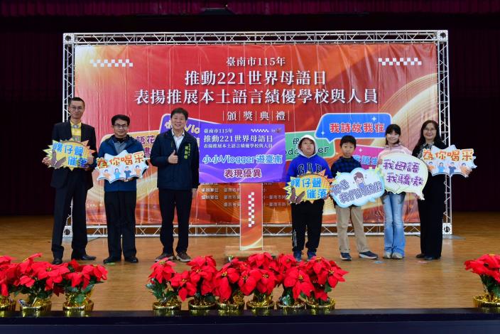 典禮中表揚多位表現優異的學生,其中西港國小於「小小Vlogger遊臺南」競賽中表現亮眼,學生以母語入鏡走讀「西港八份」,透過影像紀錄家鄉故事,展現母語應用與在地文化的緊密連結。新市國中學生韓景淮則以新詩作品《行!咱作伙來去 Fata'an》榮獲「我詩故我在」競賽第1名,作品記錄花蓮地震期間民眾彼此扶持、自願當「鏟子超人」的歷程,細膩呈現台語文學所承載的情感與記憶。