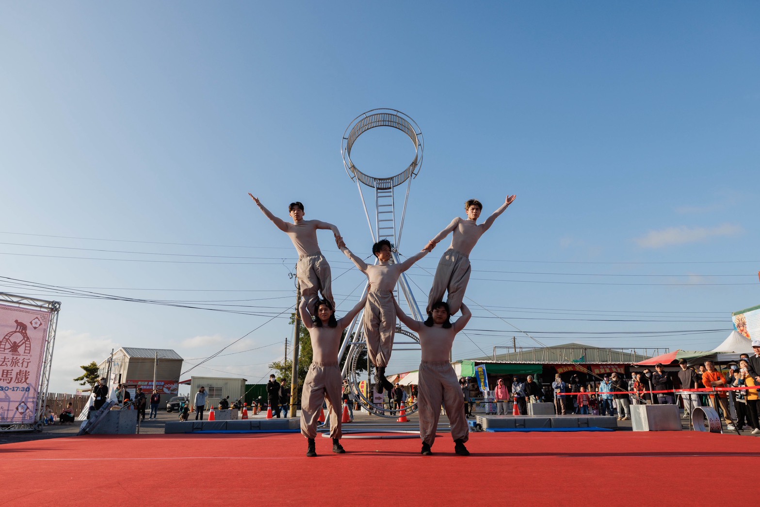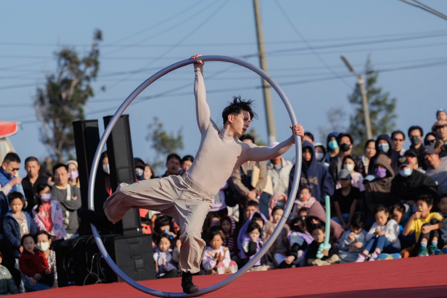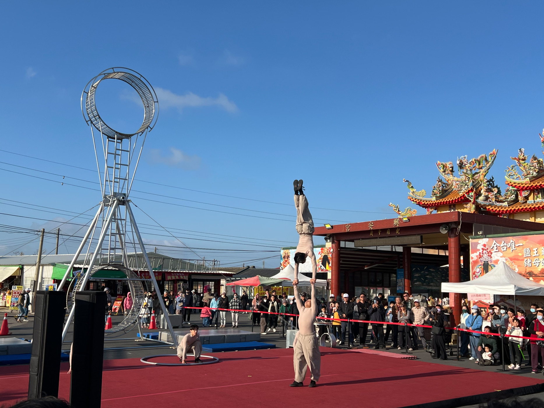 本次「神廟大馬戲」突破傳統舞台框架,將大型特技裝置移至宮廟廣場,演出團隊在高空巨輪上進行高速移動、平衡與翻轉動作,並藉由跑酷流動身法與高空走繩技巧,展現極高技術門檻與演出張力,搭配旁邊鹽田美景,讓觀眾近距離感受馬戲藝術的驚險與美感,也為北門廟埕地景注入全新藝術能量。同時,現場還有精彩魔術表演互動,讓父母小孩歡笑連連。