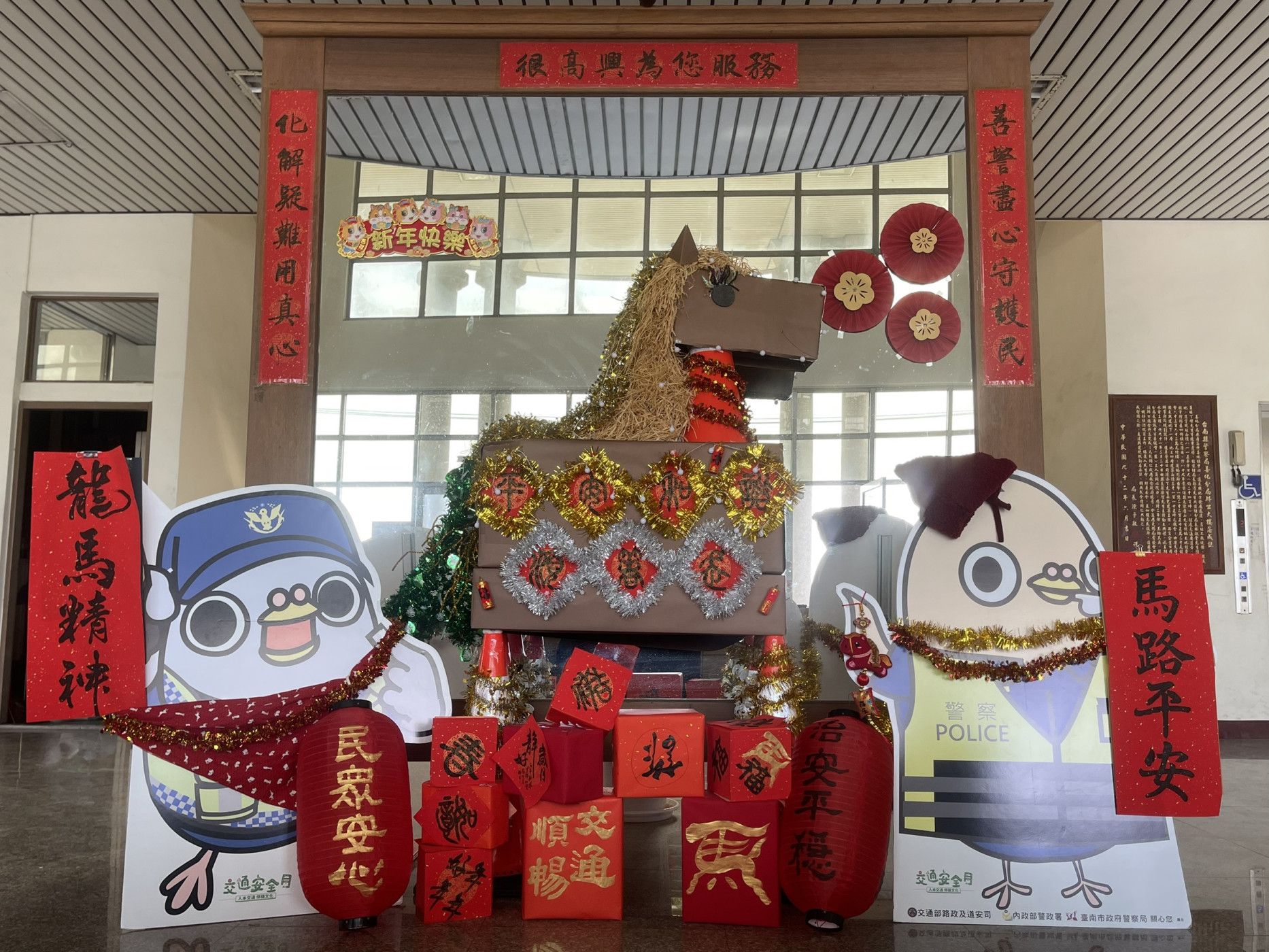 【記者田進山/台南報導】為迎接115年馬年到來,營造濃厚年節氣氛,臺南市政府警察局善化分局特別發揮創意,推出「馬年主題燈」特色布置,整體設計以「馬年」為核心意象,象徵警察全年奔波守護、全力以赴的精神,並結合在地警政元素與交通特色,巧妙將平日執勤常見的交通錐融入創作,搭配大紅燈籠及紅色禮物盒等素材,打造喜氣洋洋、別具巧思的年節景觀,不僅吸引民眾目光,也讓洽公民眾一踏入分局,即能感受到濃厚過年氛圍,同時提前向社會大眾宣告春節期間安全維護重點。
