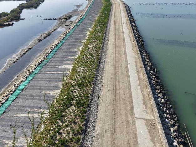 水利局補充,本工程在規劃設計階段即導入多項生態與低碳理念,減少混凝土使用,改以天然材料施作,整體工程碳排量相較傳統工法降低近九成。未來透過補植海桐、苦檻藍、馬鞍藤等原生濱海植物,持續復育濕地植生,並結合拋石工法營造多孔隙棲地環境,可望達成防洪安全、濕地生態與親水環境共融的多重效益。