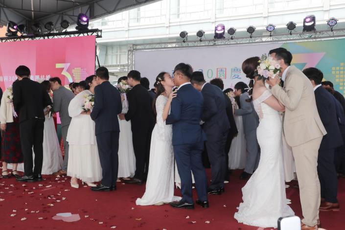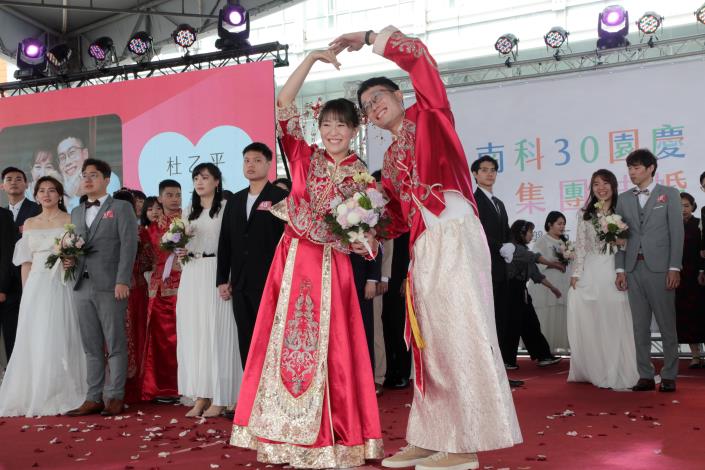 卓院長說,很高興在南科30週年之時,見證66對新人集團結婚,完成人生一個重要里程碑,象徵南科不僅孕育高科技產業,也是孕育幸福的所在。他指出,政府將經濟成長成果回饋全民,持續推動「0到6歲國家一起養」政策,今年相關預算編列達1,136億元,透過托育補助與公共資源挹注,減輕年輕家庭負擔,讓願意生、養得起,成為支持少子化對策與世代永續的重要基礎。最後,他祝福新人以經營園區的精神經營家庭,幸福長久。