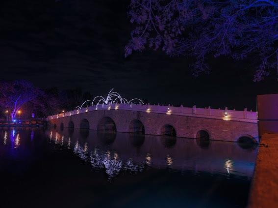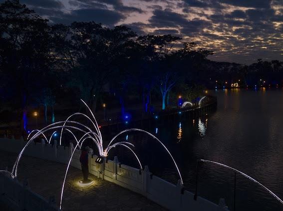 文化局說明,今年展區共規劃7件主題作品,其中包含4件互動式裝置,結合聲音、影像、水霧與感測科技,讓民眾成為作品的一部分。國際團隊SPLACES.STUDIO帶來聲音互動作品《Nidium》,可即時回應現場聲響產生光影變化;黑川互動媒體藝術打造的《共生島》,則以水霧投影營造虛實交錯的夢境體驗;新銳團隊「無邊製造」與「雜波ZAP」分別在拱橋與九曲橋設置互動光影作品,隨著步伐與跳躍,激起層層光之漣漪,為夜晚湖畔增添動感與童趣。