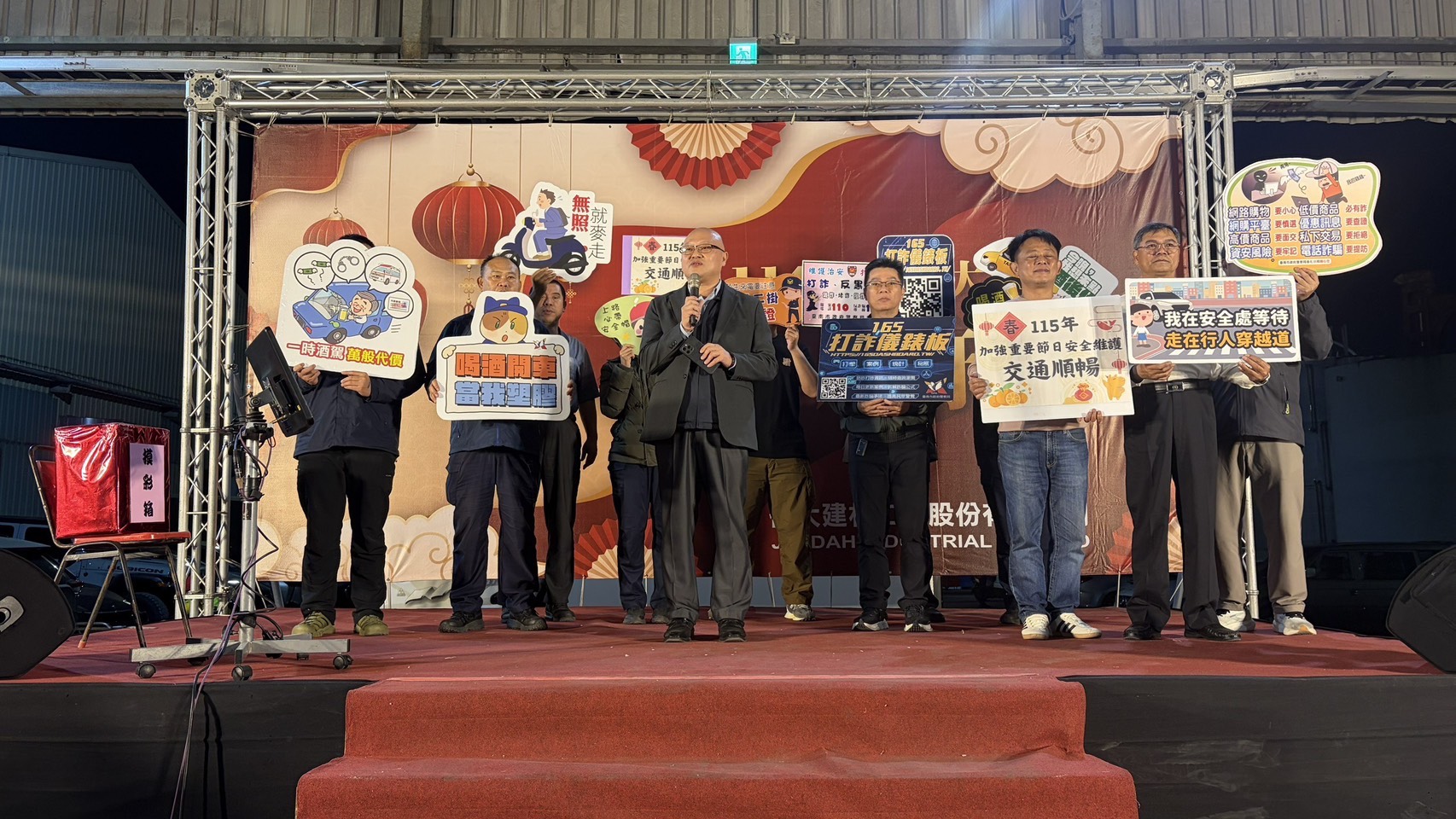 【記者田進山/台南報導】年節將至、歲末年終,各公司陸續舉辦尾牙餐敘活動,飲酒應酬機會大增,另適逢年終獎金發放期間,民眾遭遇詐騙的風險也隨之提高。為強化預防作為、守護民眾安全,臺南市政府警察局善化分局分局長劉柏陞特別率領宣導團,日前前往轄區內「定誠營造股份有限公司」及「佳大建材工業股份有限公司」公司尾牙活動現場,結合在地企業力量,向與會員工進行防制酒駕及防詐騙宣導。