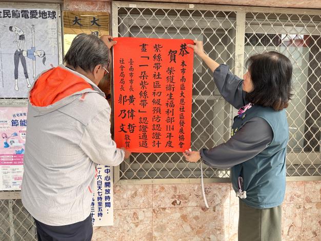 【記者陳岑博/台南報導】台南市社會局自105年起持續培力在地社區及鄰里組織主動參與,114年共有50個社區組織參與,其中包括5個領航社區、17個宣導社區及28個跨步社區,其中南區大恩社區為領航社區,本次代表南市參與衛生福利部114年紫絲帶社區初級預防認證獎勵計畫,榮獲1朵紫絲帶認證,為感謝社區長期投入防暴工作,社會局郭乃文局長代表巿長黃偉哲親自到場張貼紅榜祝賀,南區公所蕭琇華區長及巿議員林美燕本人亦出席參與,鼓舞社區持續往2朵紫絲帶認證邁進。